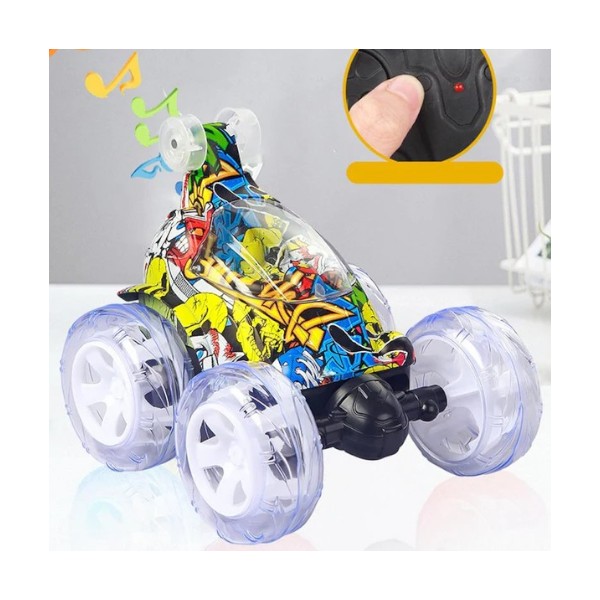 Diversión sin límites para los más pequeños! Este carro acrobático a control remoto es ideal para niños y niñas que buscan acción y entretenimiento. Su diseño colorido y resistente permite realizar giros de 360° y acrobacias sorprendentes, mientras que las luces LED integradas iluminan cada movimiento para una experiencia visual única.Ruedas TRP de alta calidad, antideslizantes, resistentes a los golpes, agarre fuerte, fácil de cruzar la hierba, arena, barro húmedo y tierra pantanosa, sin miedo.