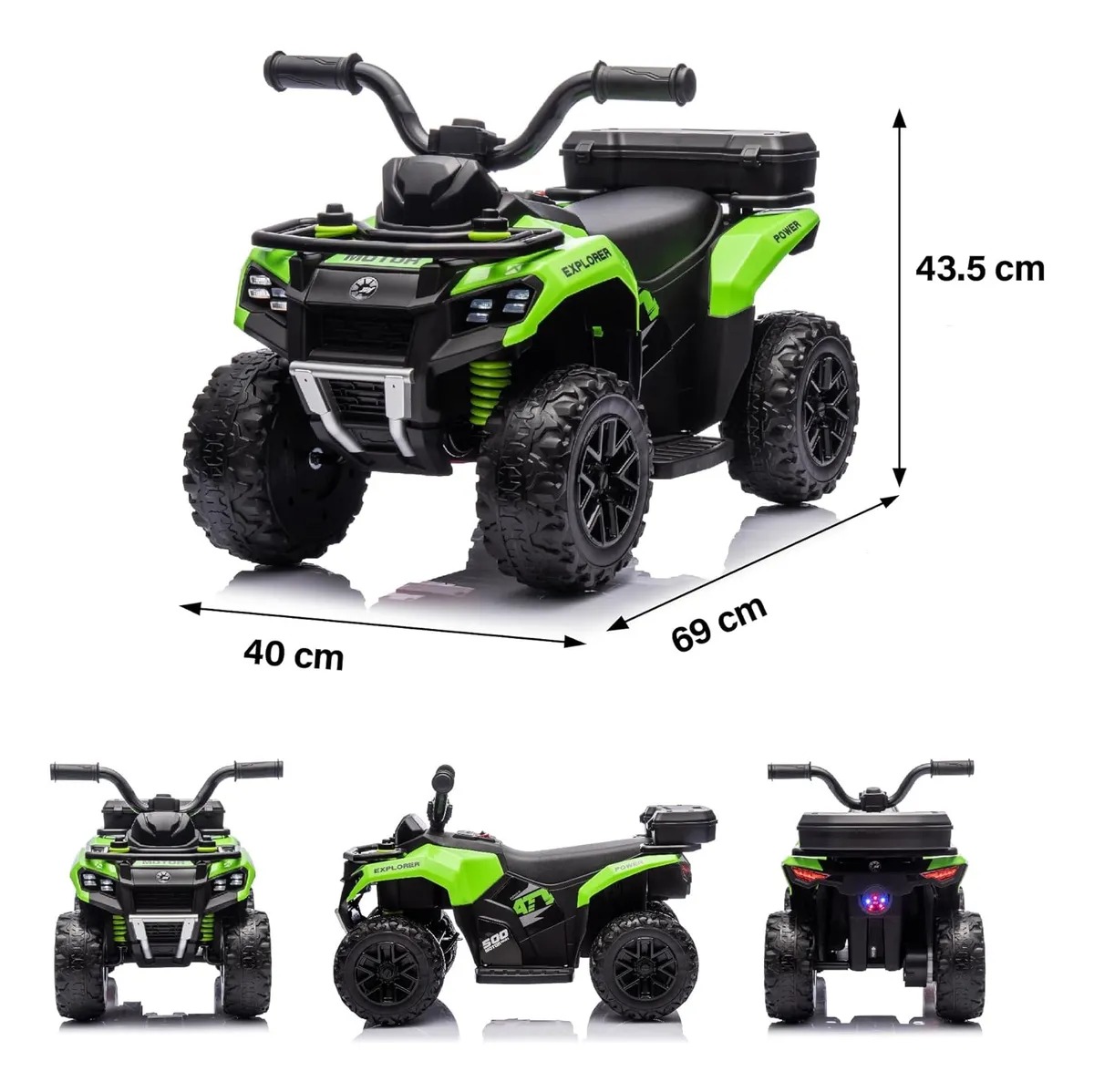 Cojinería en cuero, encendido de Botón, pintura Divina, turbina de Humo Realista, control remoto,batería de 6 voltios, luces led , melodías infantiles, 1 cargador, puerto mp3 para conectarle tu celular para reproducir música, usb puerto para música.