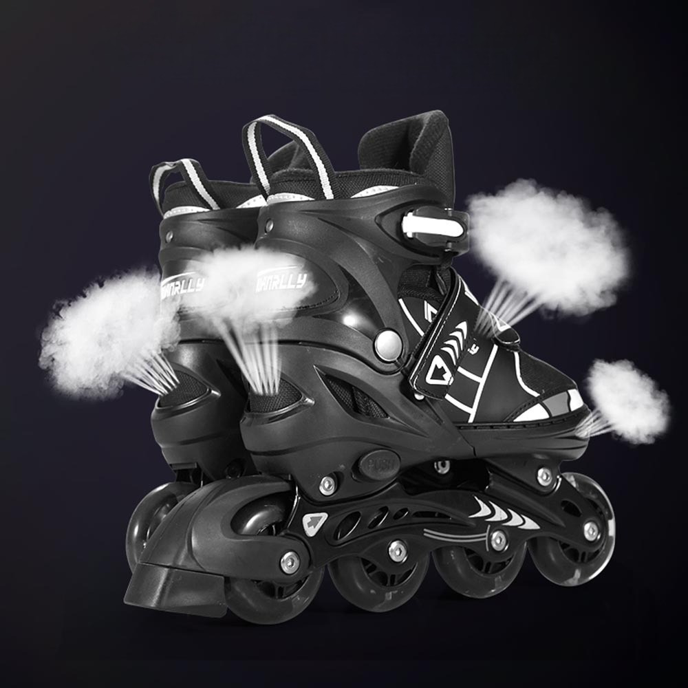 Luces en las 4 Llantas: Los patines están equipados con luces integradas en las llantas, que se encienden con cada movimiento, agregando un toque de diversión y estilo a cada paseo.Freno Trasero: Cuentan con un freno en la llanta trasera de uno de los patines.Sistema 2 en 1: Con un diseño versátil, estos patines se convierten fácilmente de 4 ruedas a línea, ofreciendo a los niños la opción de elegir el estilo de patinaje que prefieran.Talla Graduable: La capacidad de ajustar la talla de los patines de la 31-34 Talla S garantiza un ajuste perfecto para los pies en crecimiento de los niños y Protección Incluida: El kit incluye protección para rodillas, casco, protección de codo y manos. Incluye bolso para guardar los patines y las protecciones. AJUSTE DE TALLAS CON EL BOTON LATERAL