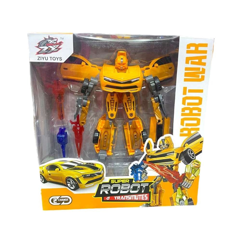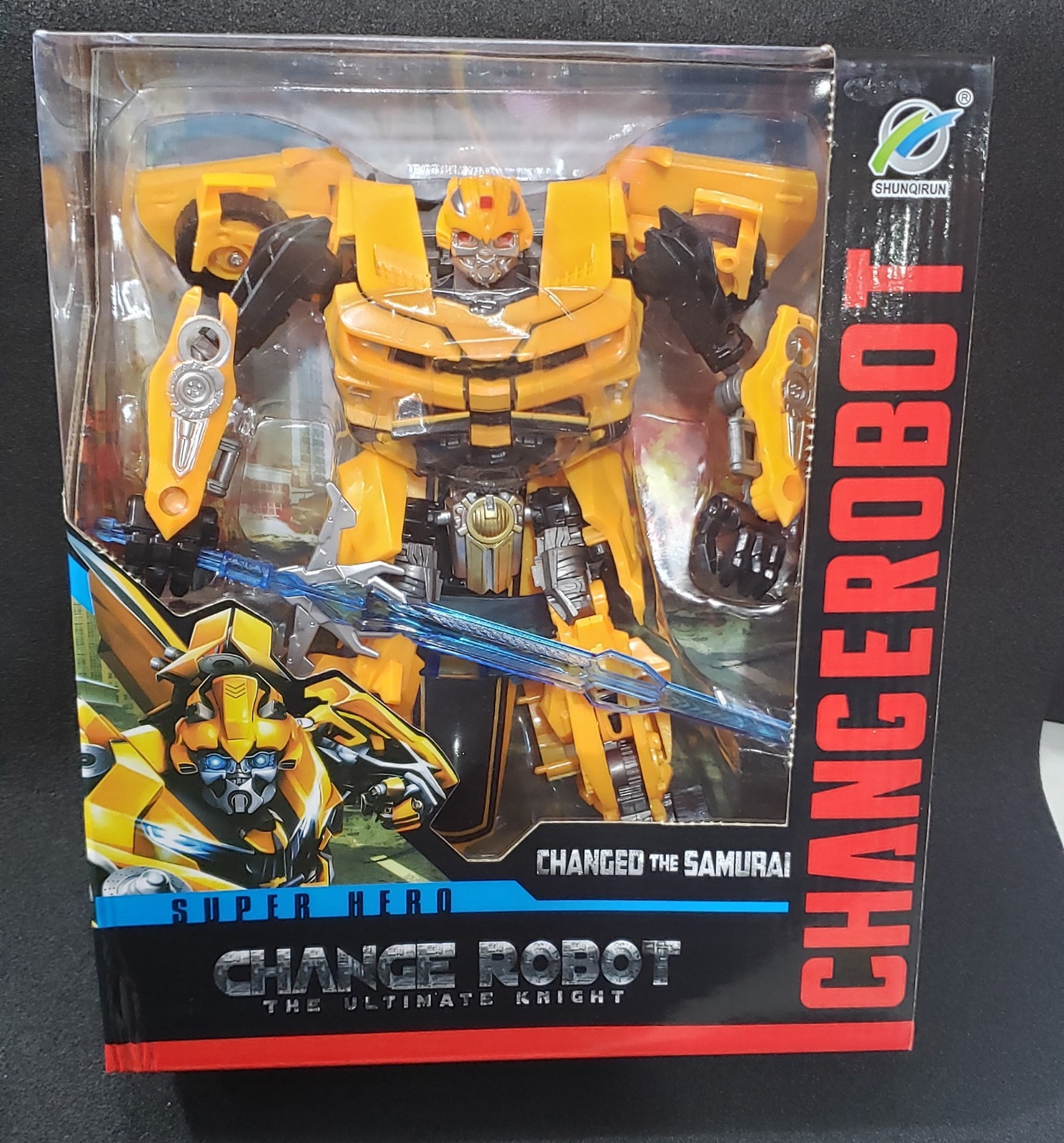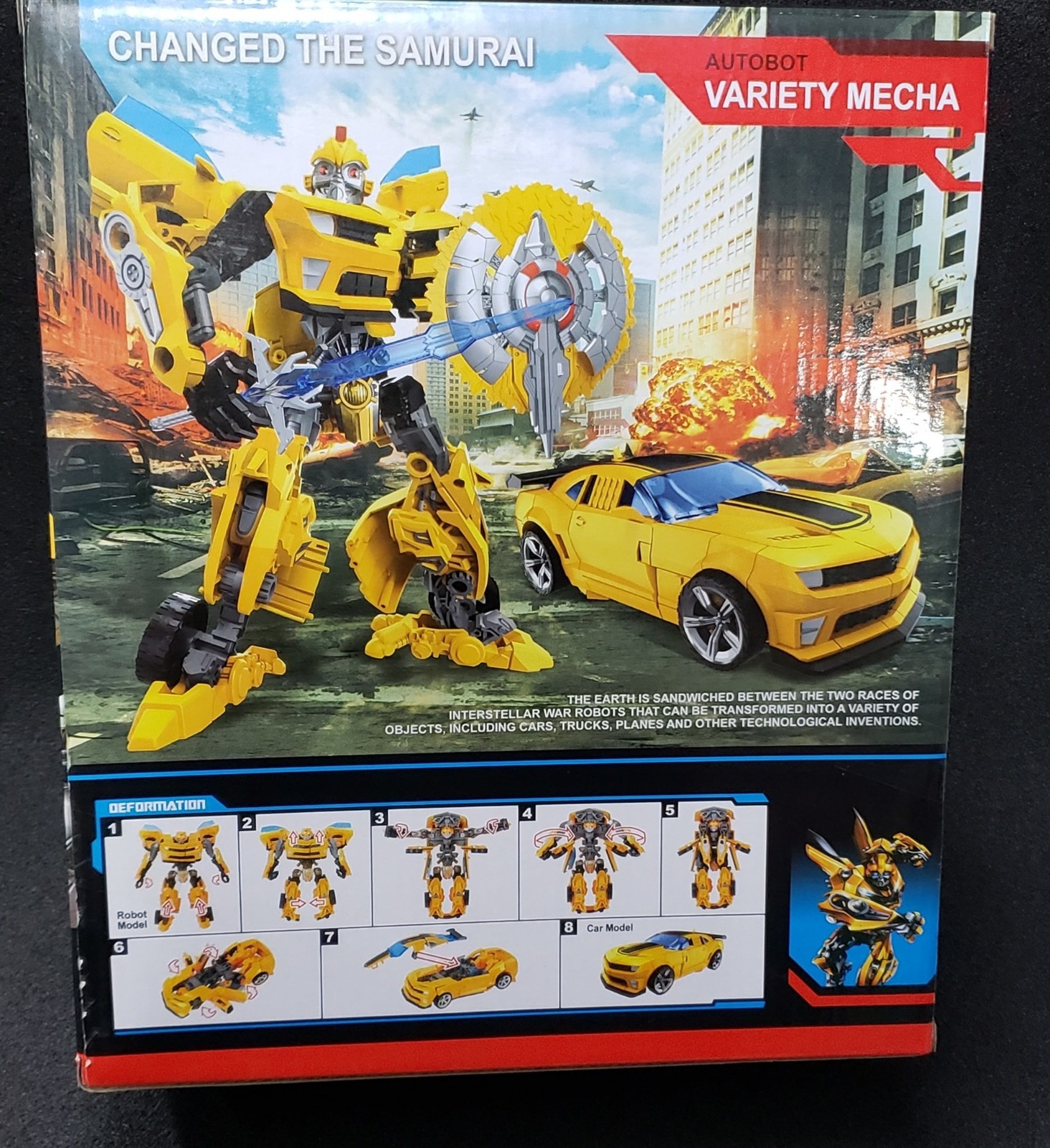 La figura puede cambiar entre su forma de robot y un automóvil deportivo, específicamente un Chevrolet Camaro amarillo, que es el vehículo característico del personaje.